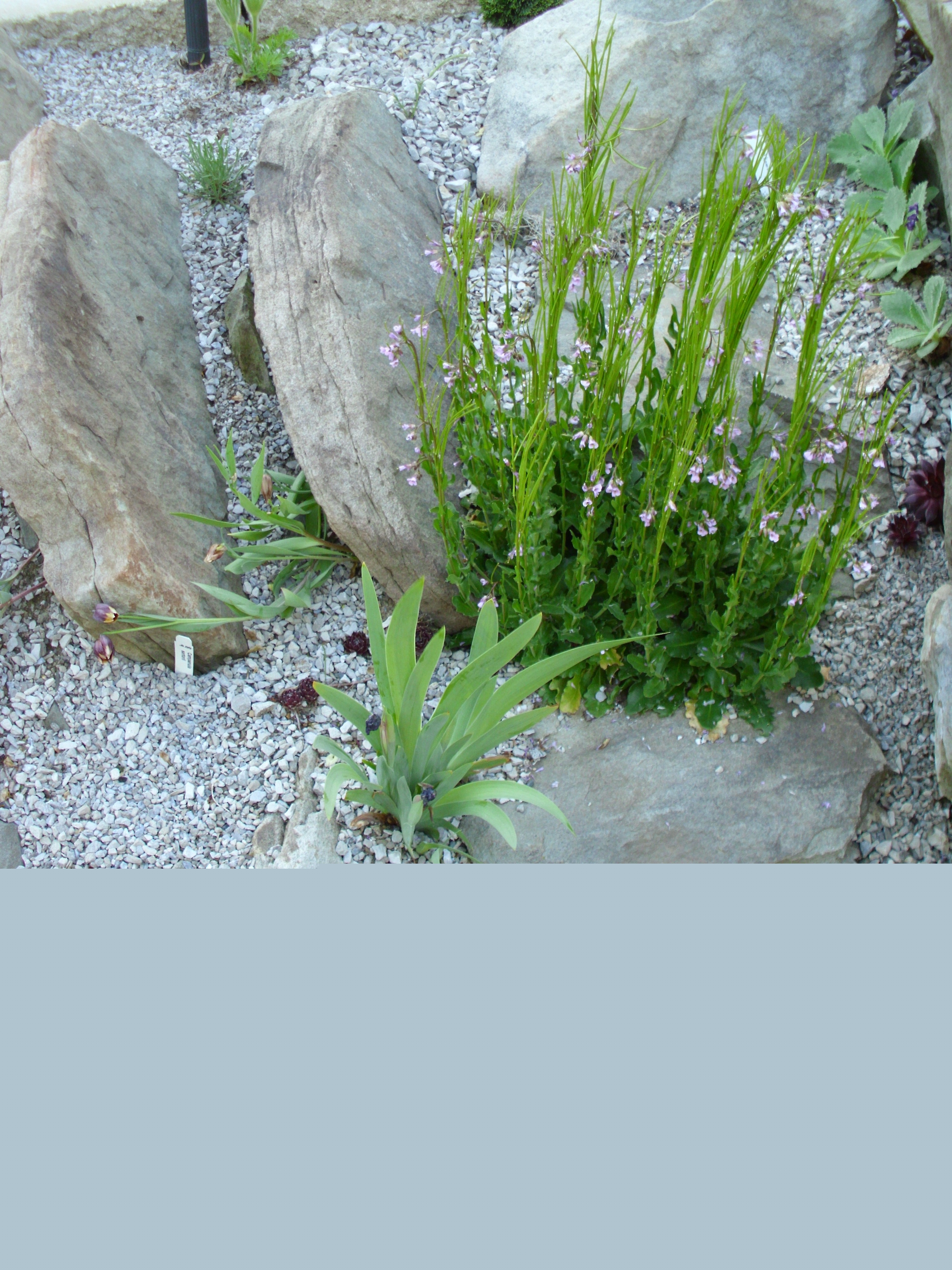 Hymenoxys herbacea clump at center, Dianthus on left, small Daphne above, two Iris species at right. |